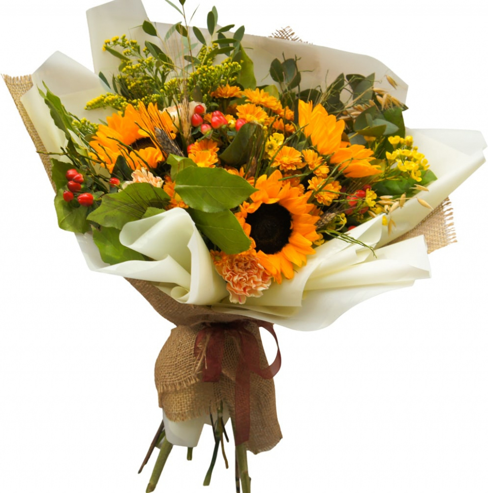 Замечательный, красочный букет из подсолнухов и желтых ромашковых хризантем с зеленью порадует ваших близких своей душевностью, трогательностью и оригинальностью. Дарите дорогим вам людям радость, говорите им о любви и вы сделаете их счастливыми!